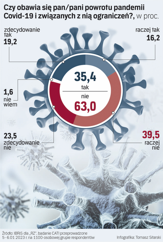 Polacy przyzwyczaili się do trwającej od blisko trzech lat pandemii Covid-19. Z sondażu IBRiS przeprowadzonego 5–6 stycznia na zlecenie „Rzeczpospolitej” wynika, że 63 proc. ankietowanych nie obawia się kolejnej fali zachorowań i powrotu obostrzeń.